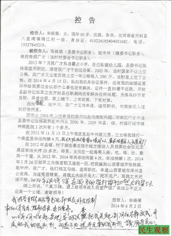 朱格菊,是河南省开封市八里湾镇锦江村一组村民,今年60岁了,一直务农为生,是个实实在在的庄稼人,上访以后倍受摧残才让她长了一些见识,多了点心眼。她的丈夫阮有义在狱中被虐待致死后,经历了许多苦难的她用她多年的上访经验继续和政府博弈。