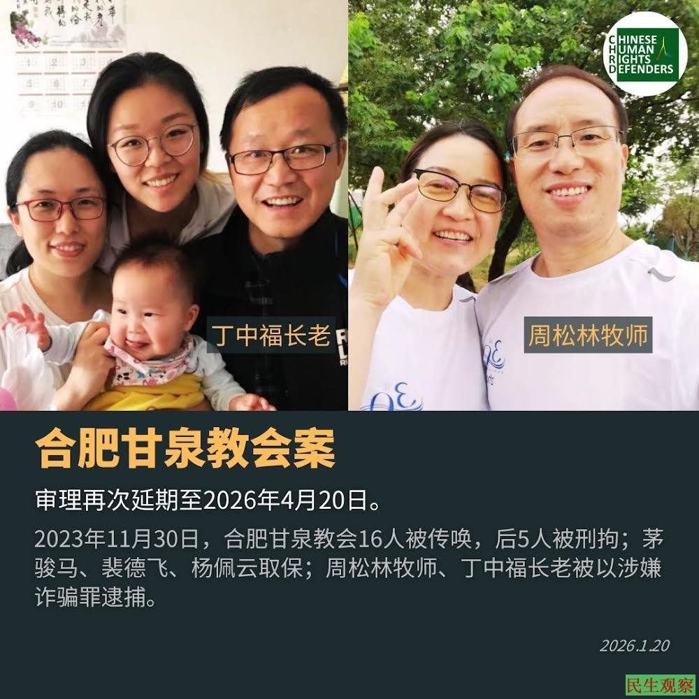 【民生观察2026年1月22日消息】安徽合肥甘泉教会周松林牧师、丁中福长老因“诈骗罪”已被羁押2年多时间。近日家属收到通知案件结果将再次延期三个月至2026年4月20日。