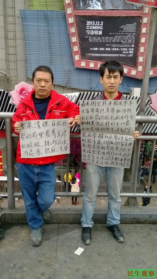 据悉,王凯先生今天下午是替他的哥哥王永维权。王凯的哥哥王永先生,半年前从广州“鑫龙图鞋业公司”离职后,就被该公司拖欠一个多月(近4000元)的工资,久拖不付。为此,他们曾多次索要都未能如愿。无奈,他们到广州白云区劳动局进行了投诉,而该劳动局的工作人员不但不予理会,反而辱骂他们,似在有意包庇“鑫龙图鞋业”的欠薪行为。