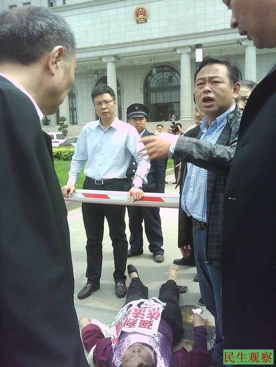 民生观察工作室2014-4-10消息:据武汉市维权人刘新群告诉本工作室,今天是武汉中级人民法院院长接待日,他们数十位访民、冤民在今天上午抵达了该院等候院长接待。但是,在他们等待许久以后,该院仍是大门紧闭不让他们进去见院长,经他们多次与守卫交涉也仍未获准进入。最后,大家就在法院门口拉起横幅、举起标语各自述说自己的冤情。在大家苦苦等待了一个上午之后,有一位名叫胡兆芳(音)的女性冤民或因体力不支而晕倒在地。此时,才见法院方面出来了几个领导模样的人,走到胡兆芳(音)的身旁观察了一下。随后,他们就叫来了120急救车将胡兆芳(音)拉走,但是此后法院方面还是不愿接见他们这些冤民。