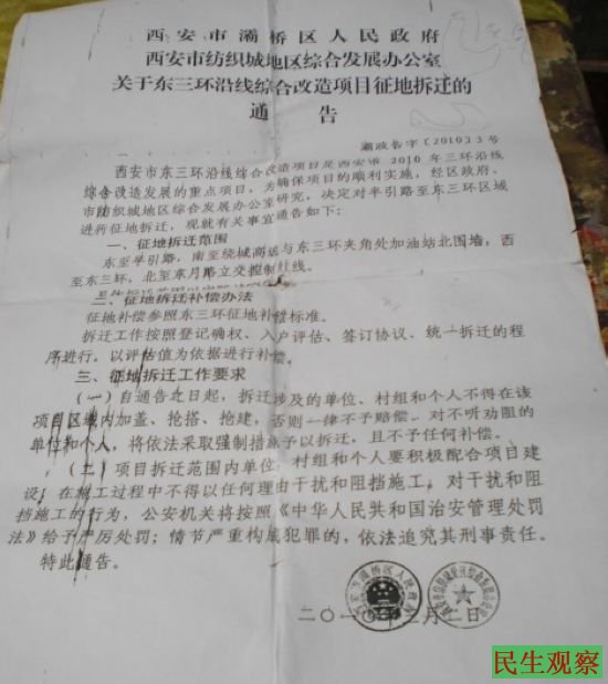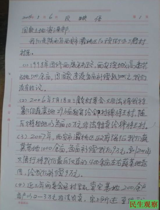 民生观察工作室2014-5-6消息:陕西省西安市灞桥区红旗街办三殿村几位村民,今天下午从到位于北京市西城区前英子胡同的国土资源部的小巷子里一脸沮丧的走出来,这几位村民操着浓重的西安口音边走边议论。上前询问得知原来这几位村民反映的是区政府和村委会非法强征村民土地,倒卖土地和宅基地等问题。他们已经向有关部门反映了4年,一点结果都没有。