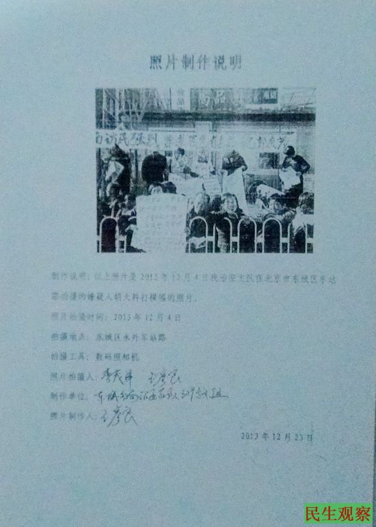 北京市公安局“309”专案组民警王彦良作证2013年12月4日胡大料在北京市东城区车站路北口西侧张打“要求罢免省委书记郭根茂”的横幅,其行为涉嫌扰乱公共场所秩序,并提供了两张现场照片。东城分局据此对胡大料做出了拘留10天的处罚决定。