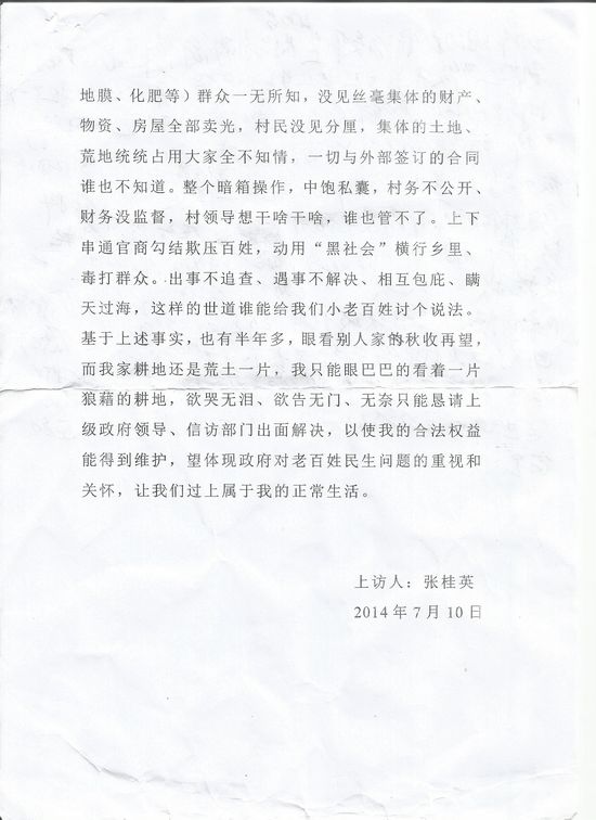 张桂英说,我有土地使用证的地被强占了,他们还光天化日之下雇佣“黑社会’’人员把我打的遍体鳞伤、手指骨折,气焰十分嚣张。现在又让我回地方,真不知道回去解决会是什么结果。