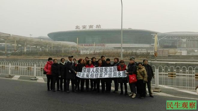 民生观察工作室2014年12月9日消息:今天上午,来自湖北省武汉市的余敬、彭汉怀、王芳、陈龙、杨忠梅、胡新建、吴鑫发,及黄石市尹旭安等在北京的访民共二十余人,齐聚北京南站,打出标语要求“保障人权 依宪治国”“ 严惩周永康”。