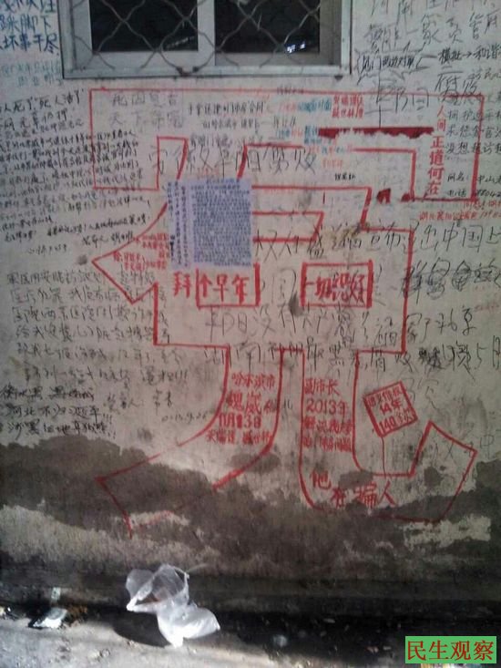 据悉,这些访民都是在中南海周边地带被劫持到府右街派出所关押的,然后派出所在把他们分流到马家楼或久敬庄(接济服务中心)。从五一到现在,被劫持访民数量一直居高不下,访民听到府右街民警感叹这几日最多达到了2万多人。不知是哪个访民还在派出所的墙上用红笔写了一个大大的冤字。