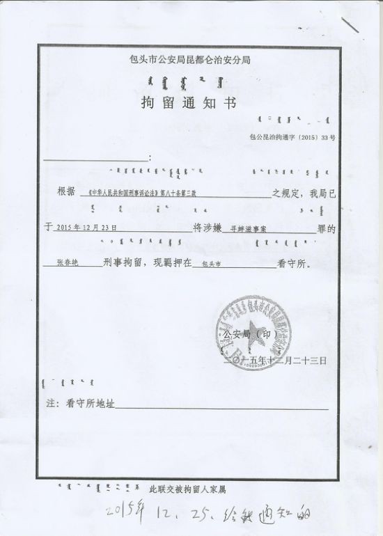 内蒙访民张春艳被以涉嫌寻衅滋事罪刑事拘留