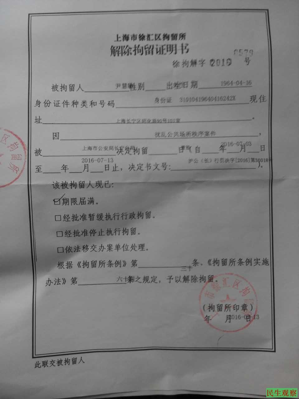 民生观察工作室2016/7/17消息:上海市长宁区访民尹慧敏,因7月1日到天安门散心游玩被北京警方查出访民身份后交地方政府带回,被长宁区公安分局以扰乱公共执行拘留10天,13日期满获释。