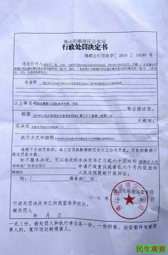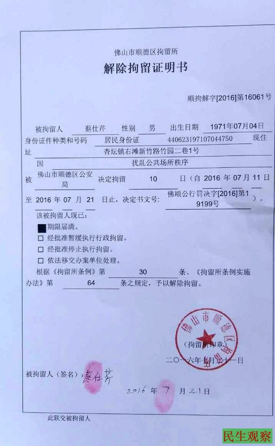 民生观察工作室2016/7/21消息:7月11日,疫苗受害者,广东省佛山市顺德区蔡仕芹被顺德区公安局决定拘留10天,今天才走出顺德区拘留所。