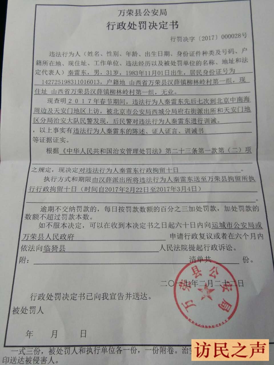 [访民之声2017/2/22消息] 2月20日,山西万荣县访民秦雷东在京被不明身份人员绑架失联,今日其家属告知秦雷东已被万荣县公安局行政拘留,关押在万荣县拘留所。