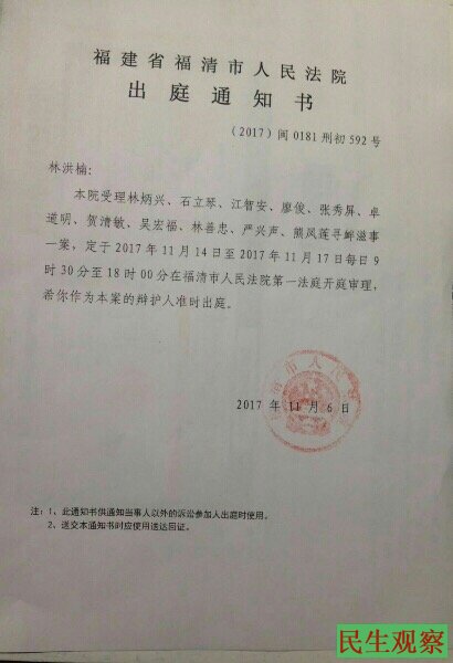 据悉,11月7日林洪楠、葛文秀、王国芳等律师均收到福清法院送达的《出庭通知书》:林炳兴,石立琴,江智安,廖俊,严兴声等11人寻衅滋事一案,定于2017年11月14日—17日每日9:30至18时在本院第一法庭开庭审理。但今天(11月8日)黄志强律师等却又收到0591-85160210电话,说合议庭成员两位同时重病,开庭改期。