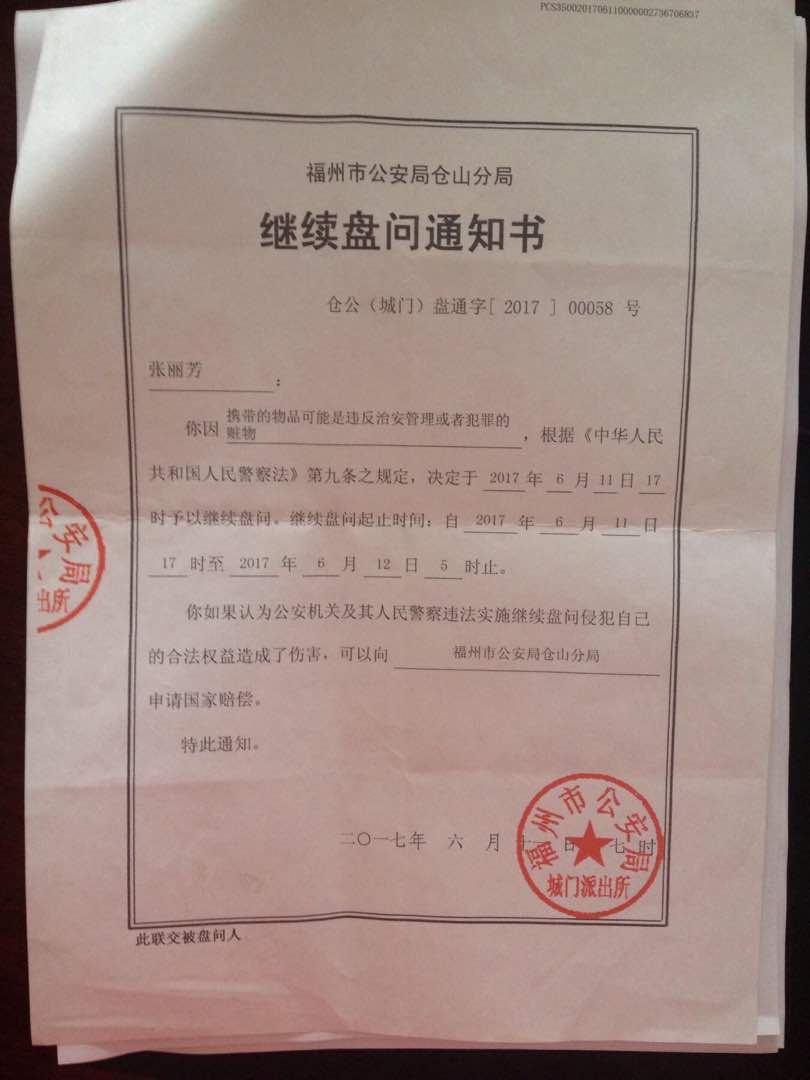 相关报道:福州张丽芳半夜获释 对“被维稳”深感不解
