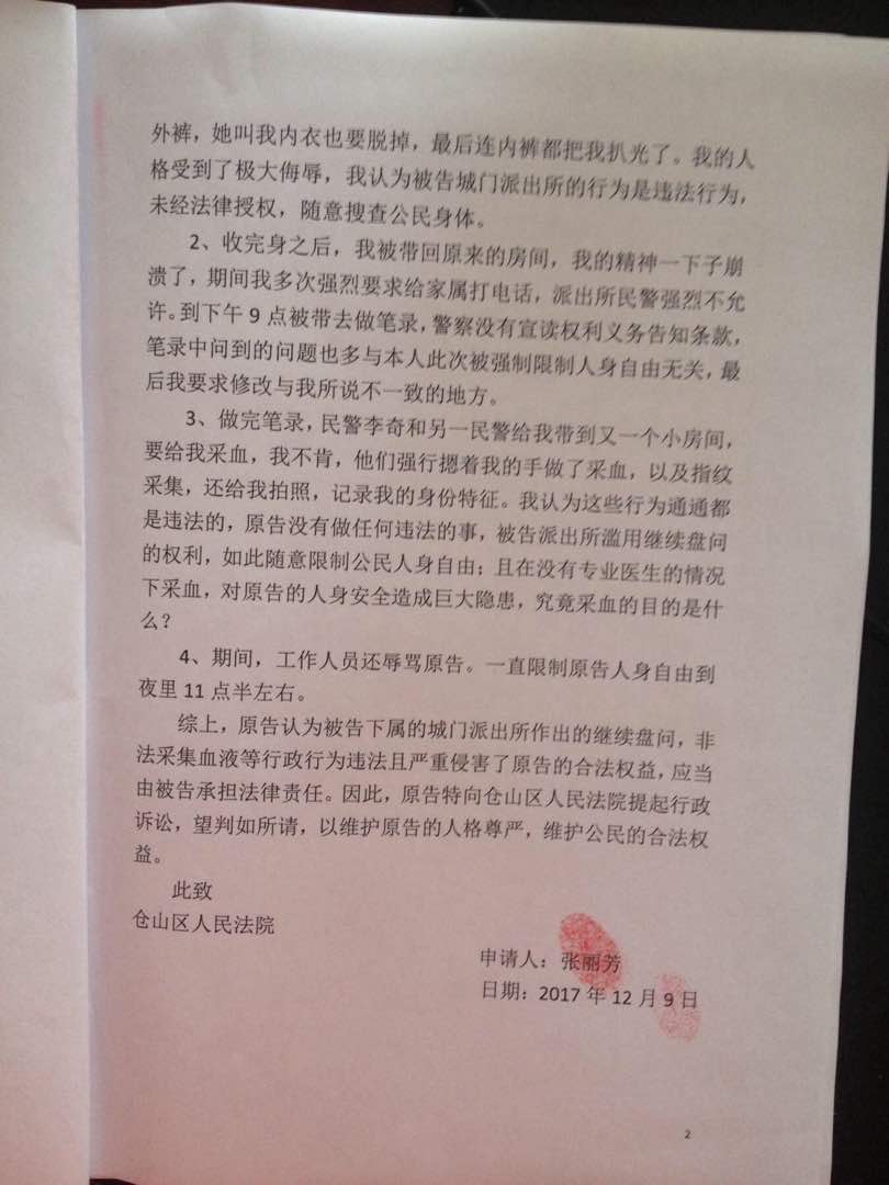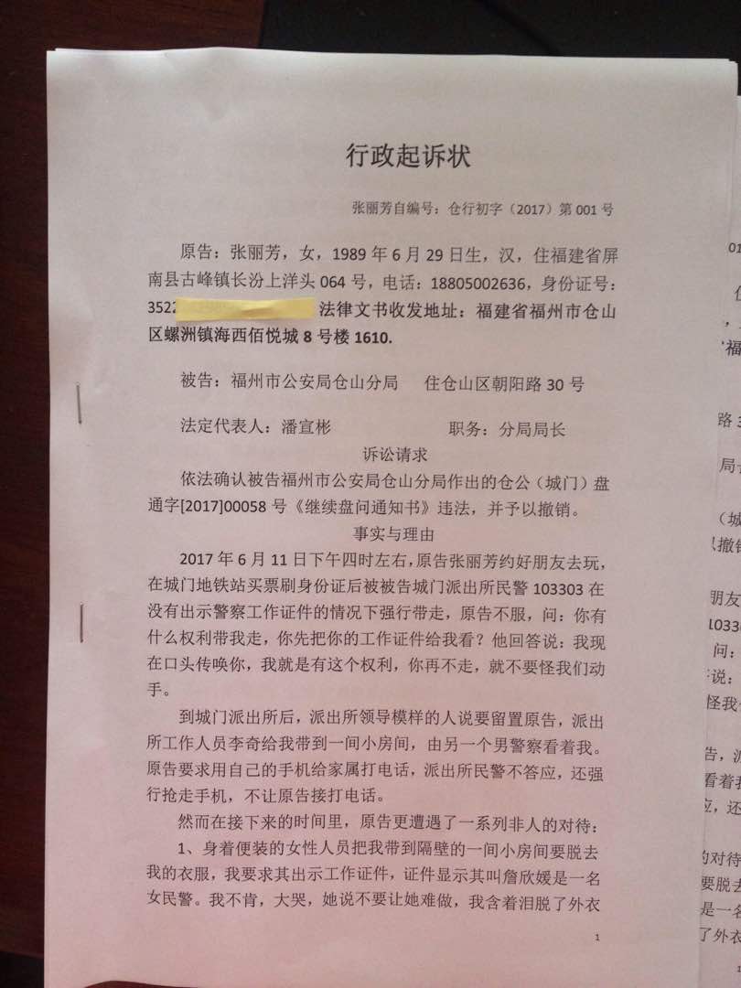 张丽芳控告福州仓山公安分局侵害、侮辱人格