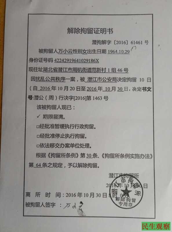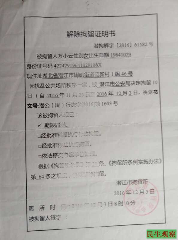 2018年3月30日,万小云收到了来自潜江当局的“解除取保候审决定书”,不料,潜江市公安局却再次将万小云“寻衅滋事”一案送往潜江检察院起诉,从起诉至今,万小云一直未收到检察院给予的任何书面法律文书,也一直未收到潜江法院开庭通知。