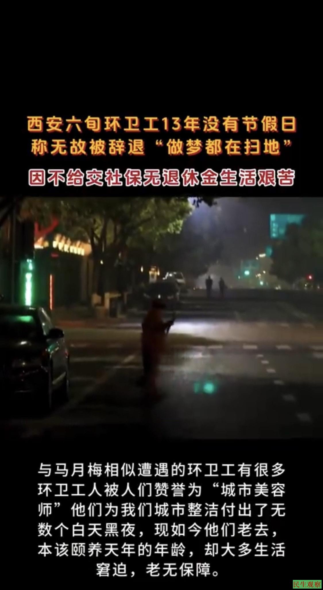 【民生观察2023年12月8日消息】近日,西安六旬环卫工13年没有节假日,称无故被辞退“做梦都在扫地”,因不给交社保无退休金生活艰苦。