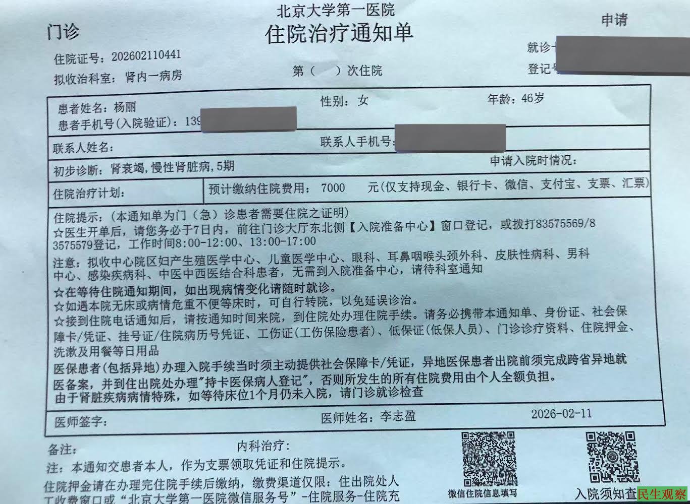 2026年2月11日,杨丽和其父母前往北京大学第一人民医院就医。当日三人到达该院后,在江苏当局的干预下,该院明知杨丽病危,却始终拒绝提供透析治疗。目前杨丽双腿已浮肿到完全无法行走,且严重心脏衰竭。她被迫在医院内举牌抗议。