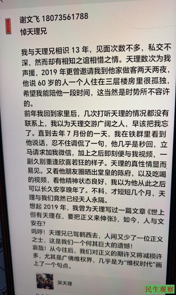 好友“谢文飞”发文悼念:悼天理兄,我与天理兄相识13年,见面次数不多,私交不深,然而却有相知之谊相惜之情。天理数次为我声援,2019年更曾邀请我到他家做客两天两夜,他说60岁的人一个人住在三层楼房里很孤独,希望我能陪他一段时间,这当然是时势所不容许的。