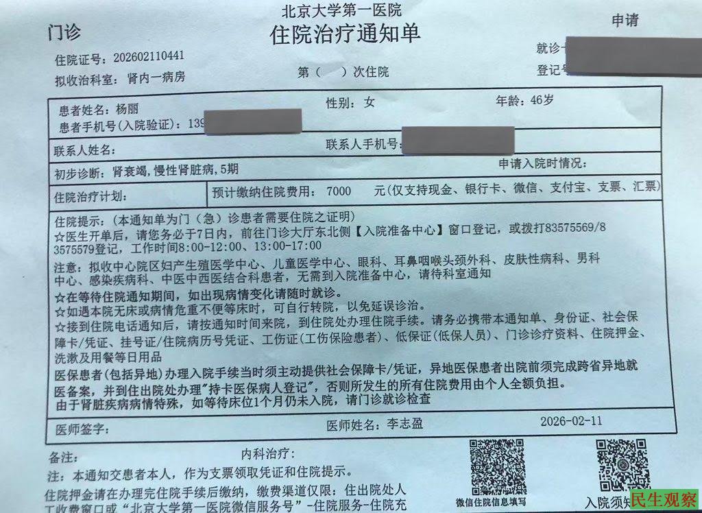 2026年2月11日,杨丽与父母前往北京大学第一人民医院就医,但医院拒绝对其进行治疗。现杨丽和父母已滞留医院十几天时间,期间,有热心网友前往探视并协助杨丽与院方交涉,希望对杨丽进行紧急透析和所需基本医疗,医生称需领导同意才能治疗。