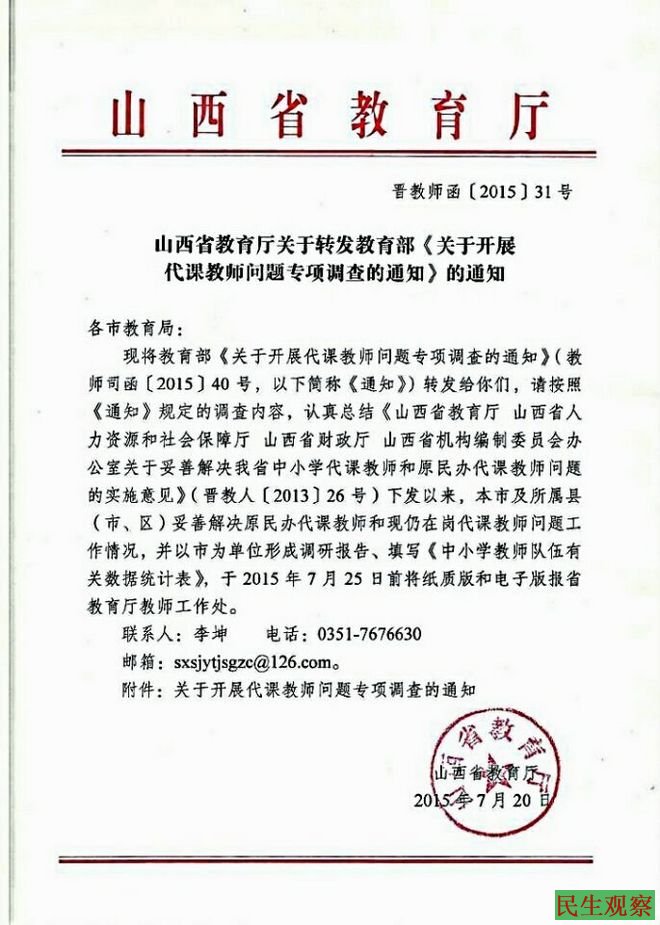 民生观察工作室2015/8/3消息:近日,本工作室不断接到全国多处地区被下岗的民办代课教师发来的信息说,他们从政府处得到消息或文件,当局在上月又下文要求清查民办代课教师问题的解决情况并上报。