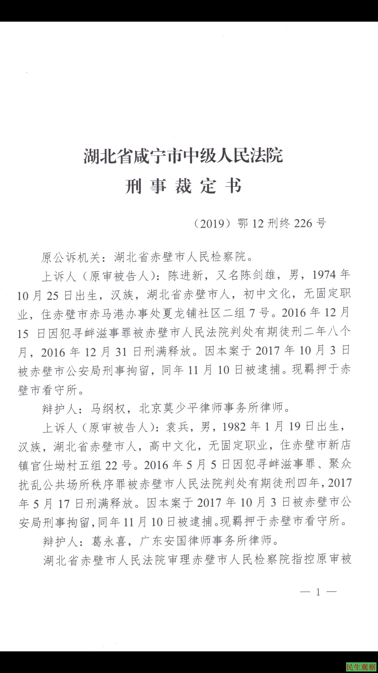 【民生观察2019年10月28日消息】本网获悉,南方街头运动践行者、赤壁五君子之 陈剑雄、袁兵,两人涉嫌“寻衅滋事罪”上诉一案,湖北省咸宁市中级人民法院于 10月22日下达判决,驳回二人的上诉,维持陈剑雄原判三年六个月,刑期至2021年4月2日;维持袁兵原判三年,刑期至2020年10月2日。