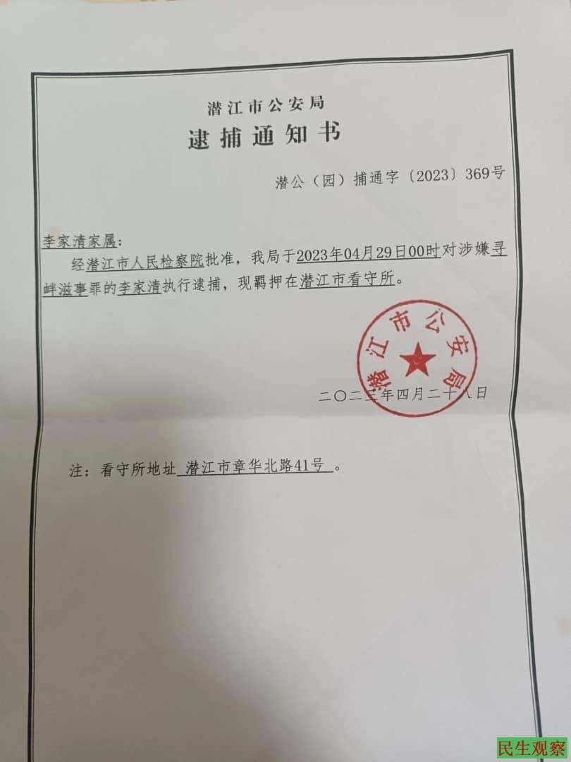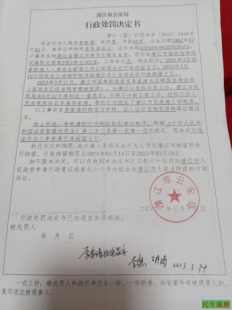 在2023年两会期间李家清在北京正常信访被当局政府部门接回潜江后被以扰乱单位办公秩序行政拘留10日、在3月20号潜江公安局随后又变更拘押期限以涉嫌寻衅滋事罪刑事拘留,到期时间为4月23日,在李家清拘押37天后的4月29日以涉嫌寻衅滋事罪拘留后遭到检察院核准逮蒱,现拘押在湖北潜江看守所。李家清案件过程与诉求全文如下: