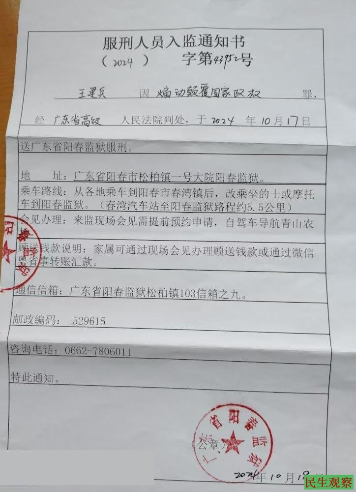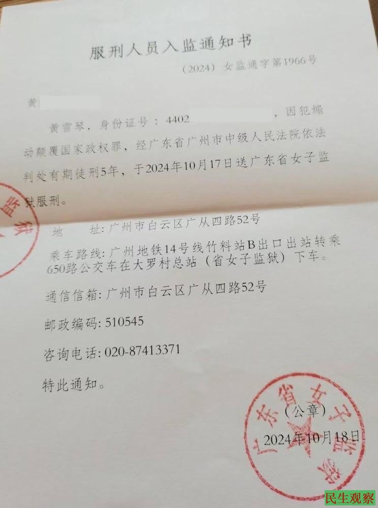 【民生观察2024年11月8日消息】本网获悉,黄雪琴、王建兵(简称:雪饼)俩人已经于2024年10月17日正式移送监狱服刑。其中,黄雪琴被送往广东省女子监狱服刑,王建兵被送往广东省阳春监狱服刑。俩人移送监狱后的近况仍然无法得知,家人和律师还不知道是否允许会见。