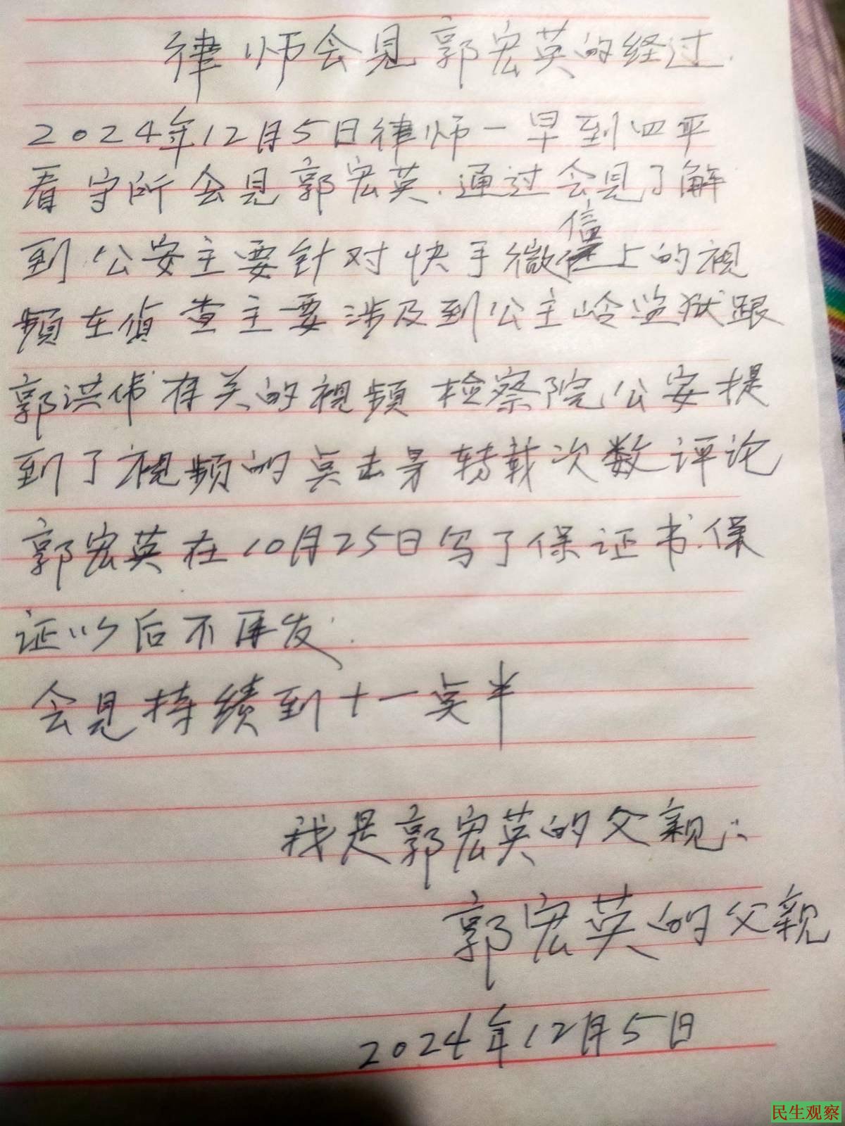 【民生观察2024年12月6日消息】郭宏英父亲发出信息:吉林四平人权捍卫者郭宏英被抓铺关押第二次律师会见,警方只要围绕郭宏英发抖音,视频号微博上的视频点击率,主要是郭宏英把哥哥郭宏伟非正常死亡的事用视频的形式发送抖音,郭宏英没有任何违法行为,就是想诉说哥哥冤死在监狱的事,吉林公主岭监狱在没有家人同意签字的情况下强行火化表示不满。郭宏英在看守所已经写了保证书不在发微博抖音视频诉说案件的真相,但是目前当局还没有释放郭宏英,吉林四平公检法部门联合制造冤假错案,把郭宏伟迫害致死,抓铺家人甚至不放过80多岁的母亲都判刑6年。