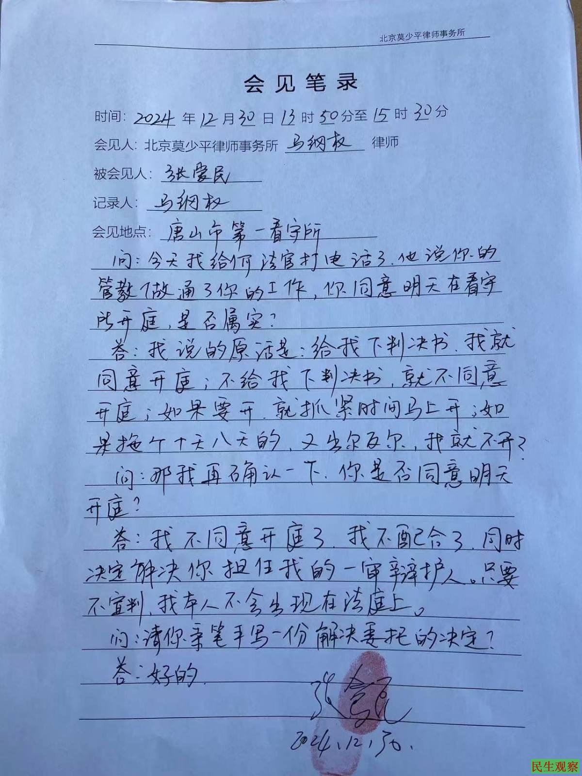 【民生观察2024年12月31日消息】唐山维权访民张爱民涉嫌寻衅滋事一案经过四次开庭任然不宣布判决,久押不判严重超期羁押,程序严重违法,法院原定明日2024年12月31日周二再次开庭,张爱民在律师会见后表态不再配合法院违法。解除了一审辩护律师马纲全。为尊重张爱民的本意律师不再代理开庭,接下来由法院即是运动员又是裁判员的自由表演