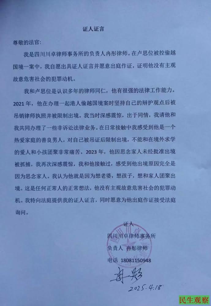 2025年4月16日,成华法院如期对卢思位涉嫌偷越国(边)境案召开庭前会议,一直持续到下午3点。案件定于18日上午10:30正式开庭。