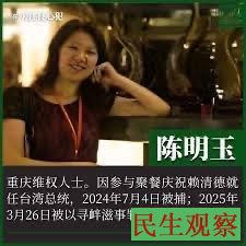 据悉,陈明玉因和访友聚餐、重庆市燃气事件以及此前在推特上为哥哥陈明华被民警枪杀一案维权,被检方指控其涉嫌寻衅滋事罪,其案件一审获刑2年6个月。陈明玉认为自己被欺骗不服一审判决,其向法院提起上诉,二审维持原判。