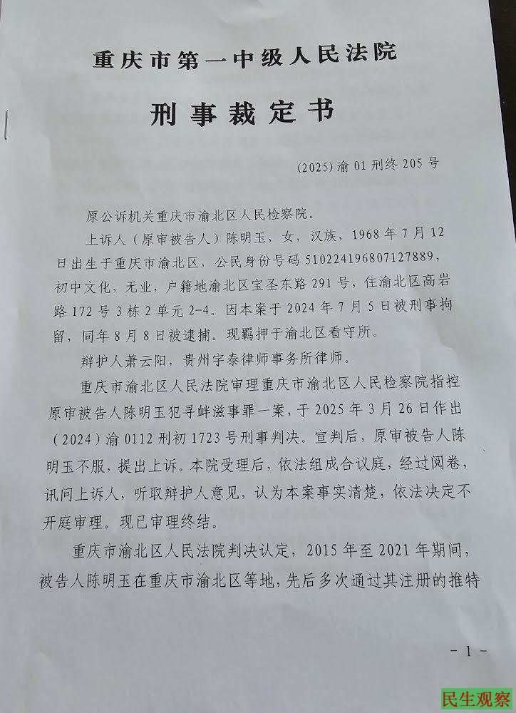 【民生观察2025年7月7日消息】重庆市渝北区公民陈明玉被控寻衅滋事罪一审获刑二年六个月,其不服一审判决提起上诉。近日,重庆市第一中级人民法院对其二审案件决定不开庭审理,并作出终审判决,驳回上诉维持原判。