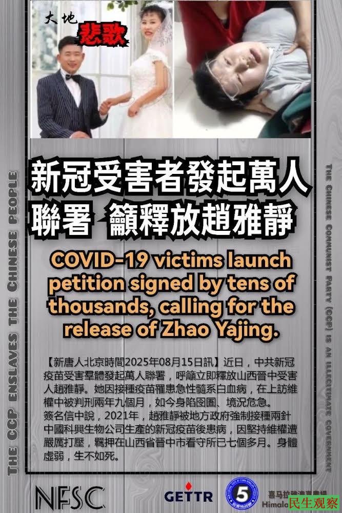 据称,新冠疫苗受害群体在获悉赵雅静因维权遭判刑的消息后,于2025年7月17日发起万人联署,呼吁立即释放急性髓系白血病人赵雅静。