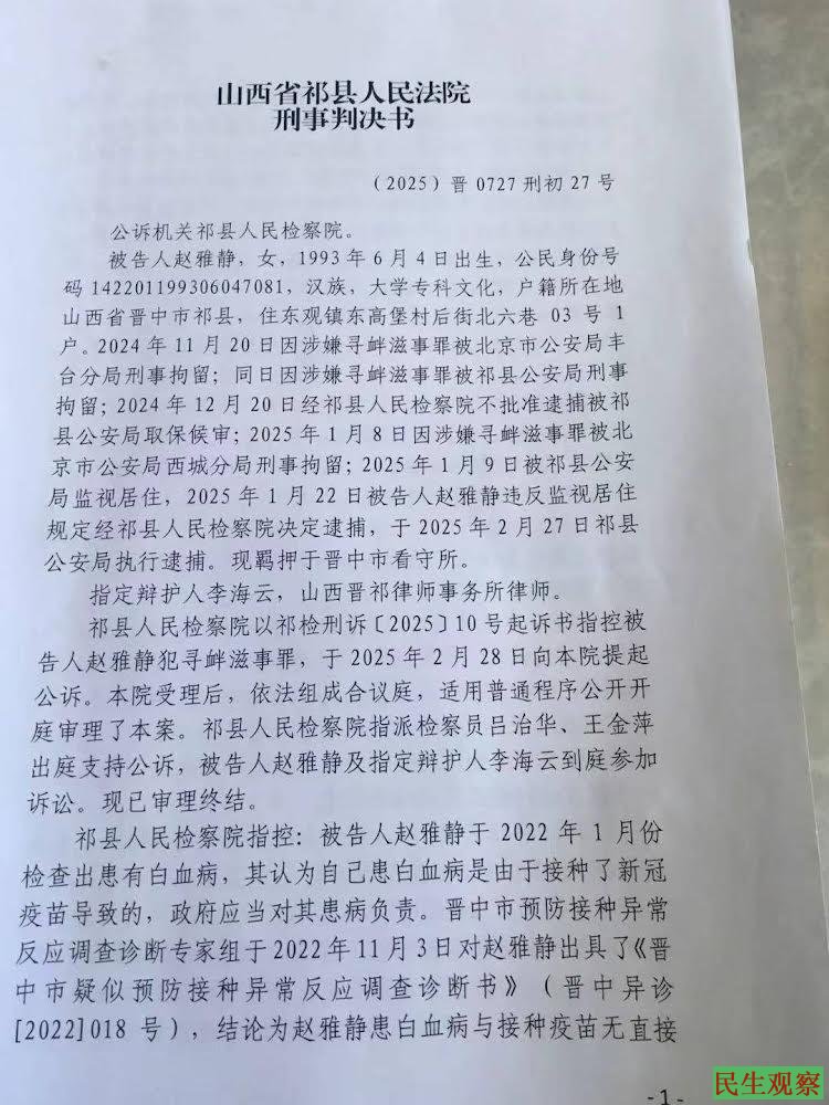 赵雅静因接种新冠疫苗导致患上白血病,至今维权4年多无果。期间丈夫王宏艺因为妻维权于2022年12月1日,被法院以“寻衅滋事罪”判刑六个月,翌年6月刑满获释。如今,赵雅静也被以相同罪名判刑入狱。