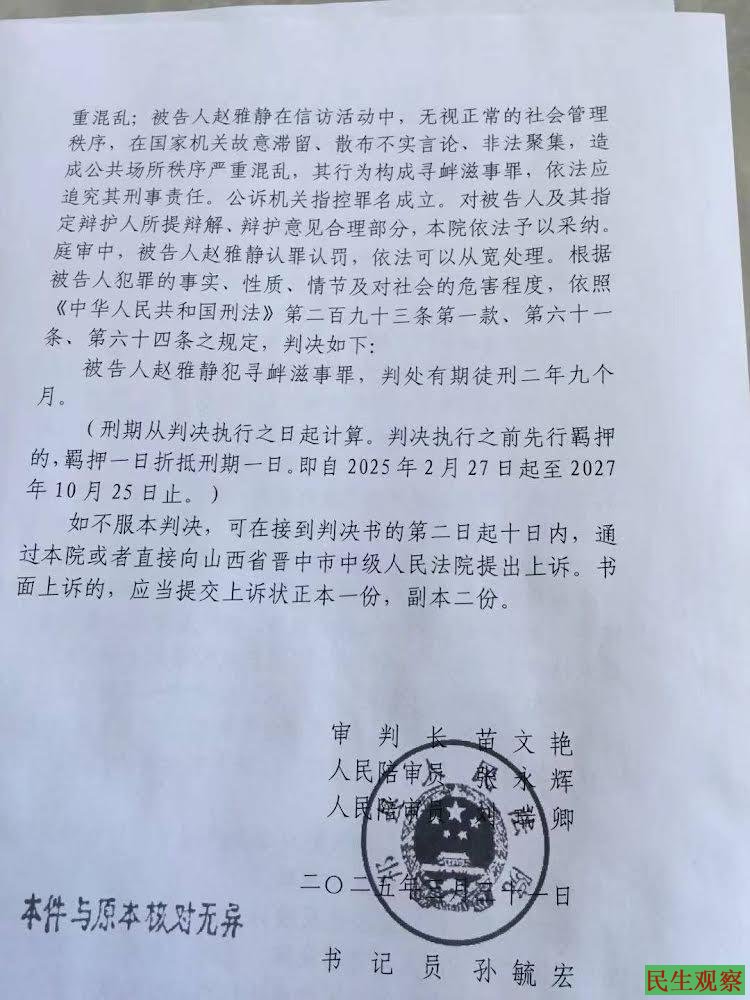2025年2月27日,赵雅静被祁县公安局抓捕,羁押于晋中市看守所,后被祁县法院以寻衅滋事罪判处两年零九个月有期徒刑。刑期自2025年2月27日起至2027年10月25日止。