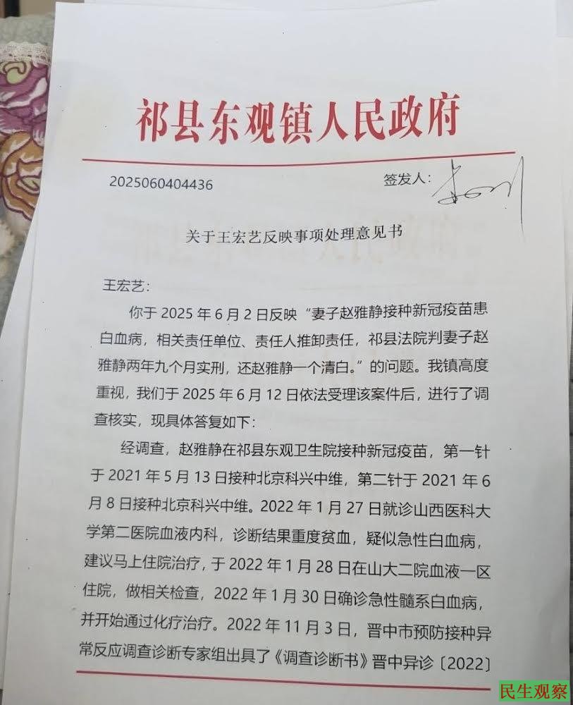 但赵雅静、王宏艺夫妻不认可上述诊断结论,认为被确诊急性髓系白血病与接种新冠疫苗有直接关系。