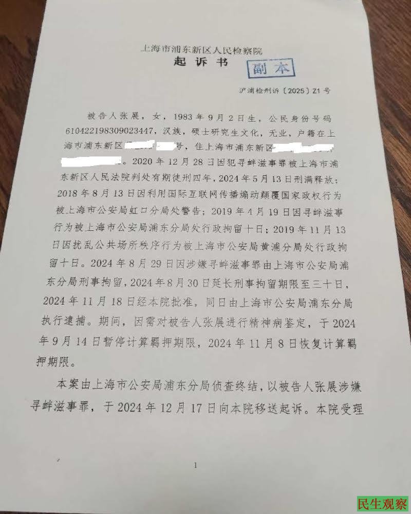 【民生观察2025年8月25日消息】张展再次被捕即将满一年,羁押期间多次被强制做精神病鉴定,其罪名为寻衅滋事罪,目前案件仍在等候上海市浦东新区法院的开庭通知。上海浦东新区检察院对其量刑建议4-5年。