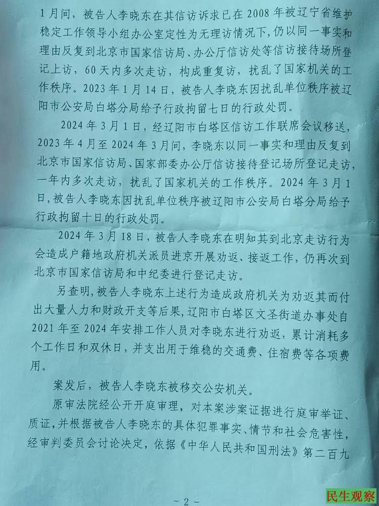 原判认定,2023年1月7日,辽阳市公安局白塔分局接到辽阳市白塔区人民政府信访局移送线索,2022年9月至2023年1月间,被告人李晓东在其信访诉求已在2008年被辽宁省维护稳定工作领导小组办公室定性为无理访情况下,仍以同一事实和理由反复到北京市国家信访局、办公厅信访处等信访接待场所登记上访,60天内多次走访,构成重复访,扰乱了国家机关的工作秩序。2023年1月14日,被告人李晓东因扰乱单位秩序被辽阳市公安局白塔分局给予行政拘留七日的行政处罚。