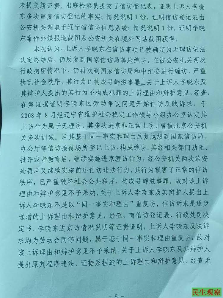 4.一审判决将李晓东的上访行为拔高作为刑事犯罪处理,不符合司法改革方向。