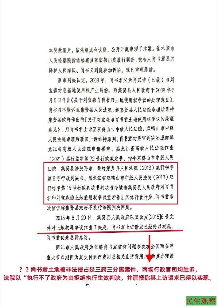 据悉,肖书君因房屋宅基地被抢,2013年两场行政诉讼案均胜诉,但法院以“法院执行不了政府”为由推脱,拒绝执行判决结果,致其上访维权多年。