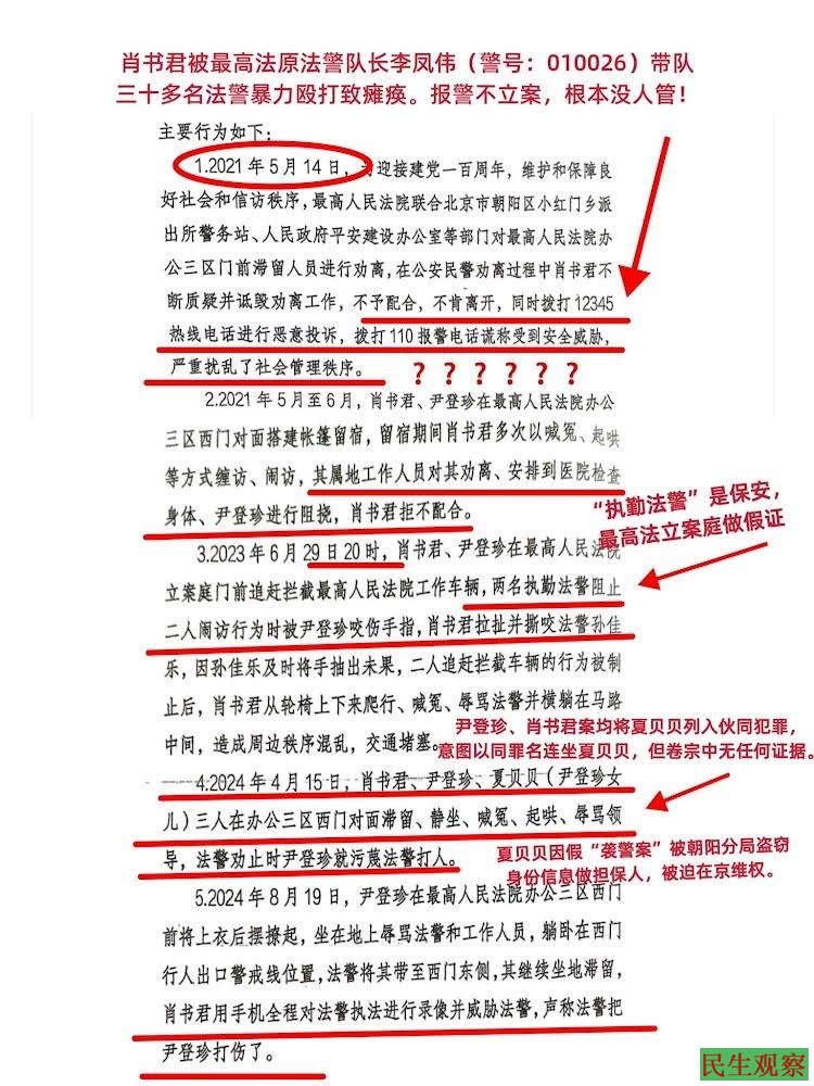 2021年5月14日,肖书君在最高人民法院被原法警队长李风伟(警号:010026)带三十多人殴打致瘫痪,同江市人民法院不仅否认该事实,反而将110报警电话、12345投诉电话记录称做是“严重扰乱社会管理秩序”“恶意投诉”。肖书君被殴打致瘫痪后,被迫在原地躺了一个多月,无任何单位出面解决,朝阳警方称“最高人民法院法警级别太高,他们无权限立案”。