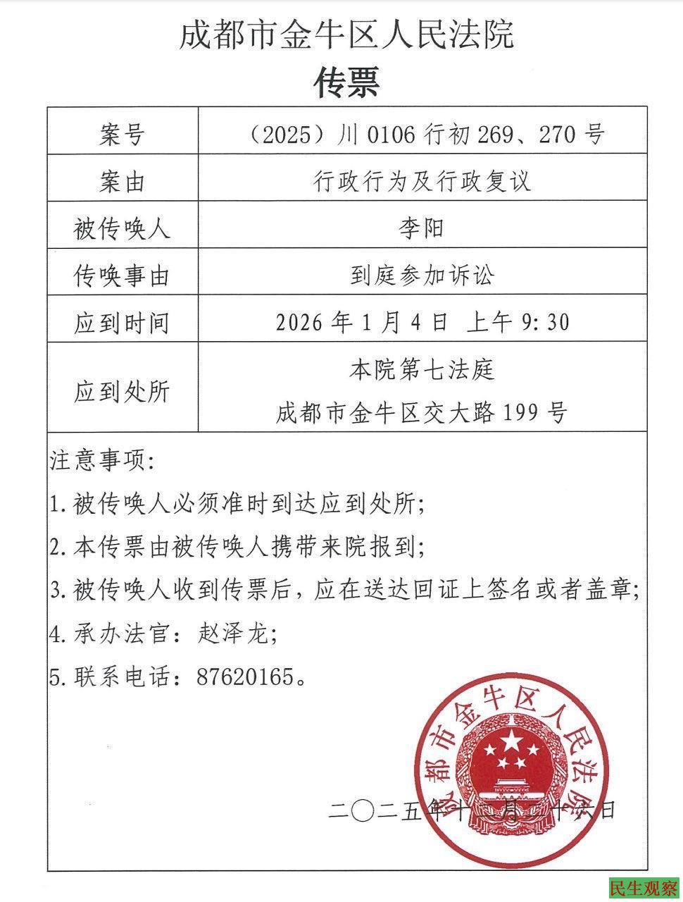 【民生观察2026年1月6日消息】2025年的最后一天,定居在成都金牛区,20多年活跃在四川维权一线的独立个体,退役军人军官维权群体川籍联络人,参与多个维权个体出庭代理的公民代理人李阳,突然收到成都市金牛法院就“控告金牛公安非法行政拘留”一案的开庭传票。传票通知:开庭时间为2026年1月4日上午。地点:金牛法院。