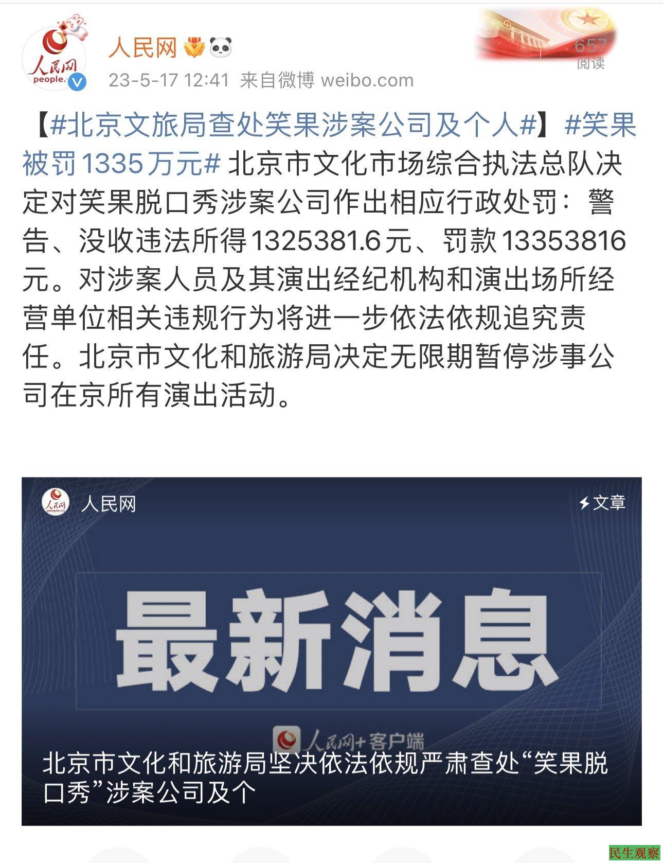 笑果文化公司旗下的脱口秀演员李昊石在演出中,因笑称野狗“能打胜仗、作风优良”被上纲上线指“侮辱”人民解放军,遭无限期停止演出并被警方立案调查带走,笑果文化公司也遭到当局1335万的天价罚款,暂停线下演出。