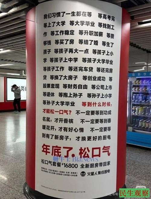 2026年1月中旬,上海地铁徐家汇站一则再普通不过的广告“年底了,松口气”被指“贩卖焦虑”而被官方撤下。该广告以“我们习惯了一生都在等,等高考完,等上了大学,等找到工作,等生了孩子,等还完房贷……等到什么时候,才能松一口气?”为主题,通过罗列人生阶段,推广某品牌厨电套餐。