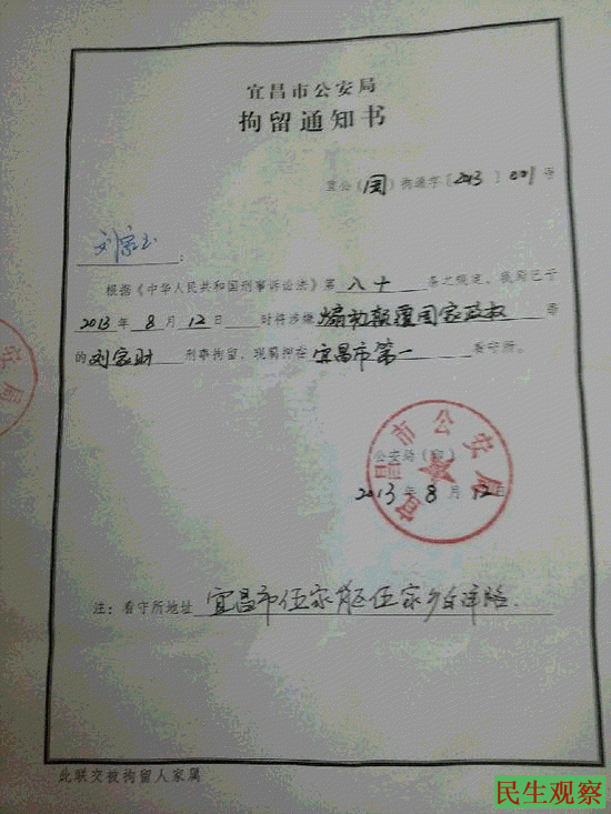据刘家财的妹妹告诉本工作室,昨天上午,她还到宜昌市拘留所看望了她哥刘家财,刘家财当时还很乐观地以为12号拘留期满他就会出来。可谁知今天下午4:30分左右,刘家财的妹妹就接到了宜昌市公安局葛洲坝分局的电话让她去一趟。刘家财的妹妹到葛洲坝分局后,宜昌市第一看守所的二名警察也在那儿。葛洲坝分局的警察出示了刘家财的刑事拘留书,看守所的警察说刘家财已由拘留所转到了看守所。