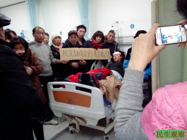 今天早上,本工作室联系上了正在北京南苑医院的董奎红等人,据董奎红等介绍,昨天晚上十点过后,吉林省公安厅罗姓处长带领上百名社会人员闯进马家楼吉林厅。当时该厅约还有十七名访民,大家见截访者来势汹汹,分别躲进了厕所等处,结果该罗处长竟指使手下用铁棍等强行撬门,撬开后对访民拖的拖拽的拽往外拉,访民们不从即遭这些人员殴打,当时几乎所有访民都被打。