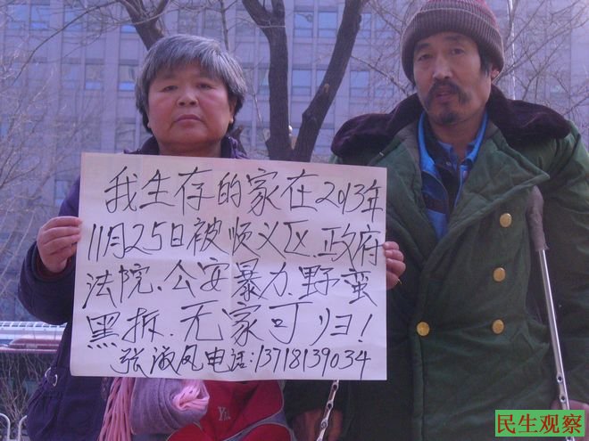 民生观察工作室2014-1-3消息:本工作室2013年12月9月曾报道了北京市顺义区仁和镇前进新村居民张淑凤、张德利家被强拆的消息(北京法院创“拘留”式拆迁 张淑凤夫妇被拘期间房子被拆