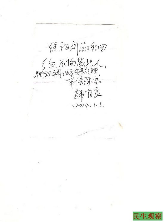 民生观察工作室2014年3月22日消息:刘淑香是来自黑龙江省穆棱市八面通镇四平村工区路8号的居民,近期因上访连续被拘留,现还在拘留所中,而就在此前的1月1日穆棱市信访干部韩有良亲书保证回家后不拘留刘淑香。