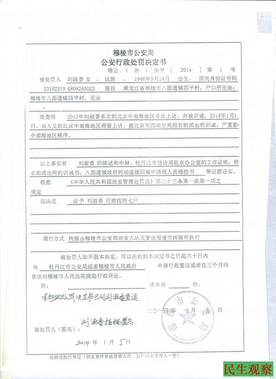 可1月5日,回到穆棱市的刘淑香就被拘留七天,理由是2013年和2014年1月1日刘淑香多次到中南海地区上访。对此不服的刘淑香从拘留所出来后,再次进京上访,结果3月13日刘淑香再次因到天安门、中南海上访被拘留十天,20号刘淑香被送进了拘留所。