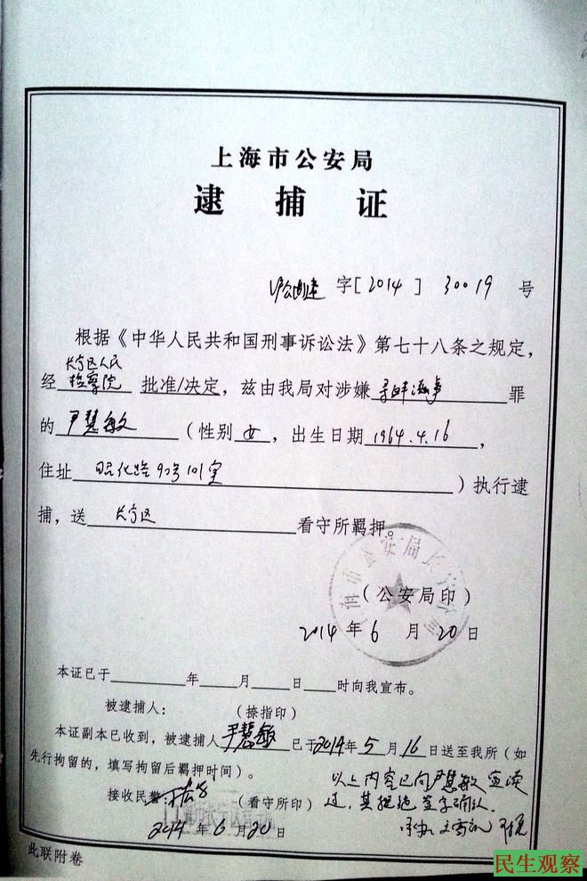 这位律师是上海的吴律师,9月24日吴律师到长宁看守所会见了尹慧敏,并复制了逮捕证、讯问笔录、搜查记录等相关文件。据尹慧敏介绍,她是今年5月16日上海亚信峰会期间被抓的,警方重点询问她打标语等事宜,6月20日被批准逮捕。