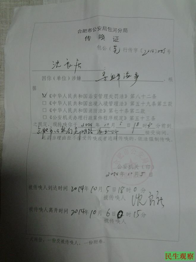 据今天下午已获释的沈良庆先生告诉本工作室,昨晚六点左右,他和尹春先后被他们所在的合肥市芜湖路派出所和望湖派出所从家中带走。警方当时出示了传唤证,传唤理由是涉嫌寻衅滋事。同时,警方还出示了搜查证。沈良庆家中一台电脑主机和一部照相机被扣押,尹春一台电脑主机和一部平板电脑被扣。