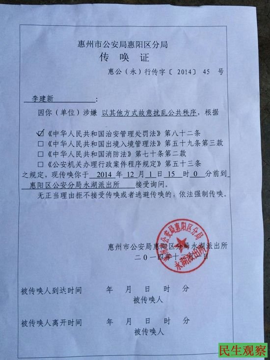 民生观察工作室2014-12-1消息:广东惠州公民李建新(网名:网络举报人惠阳欧伯),在今天下午3点左右,被广东惠州惠阳区永湖派出所警方传唤。